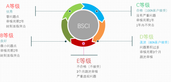 BSCI认证根据审核结果分为六个等级:A、B、C、D、E以及None零容忍。这些等级决定了工厂在社会责任方面的表现,并影响认证的有效期和客户的信任度。