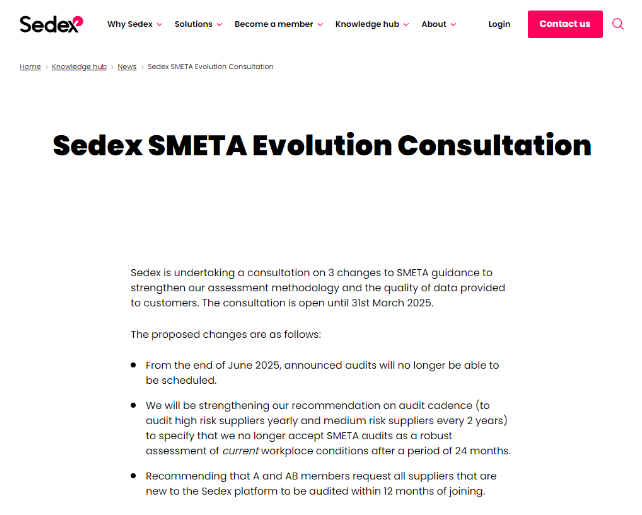 同时,Sedex将加强对审核周期的要求:高风险供应商需每年进行审核,中等风险供应商每2年进行审核。为了强调上述审核周期的要求,自2025年3月5日起,Sedex不再接受超过24个月(即两年)的SMETA审核报告作为对当前工作场所条件的有效评估依据。
