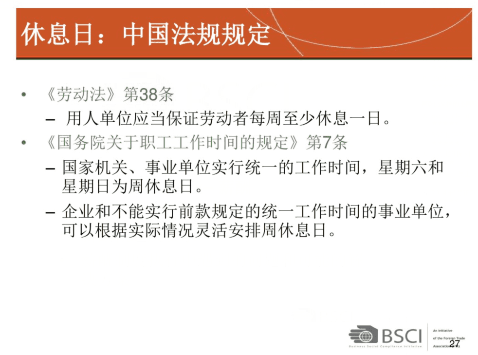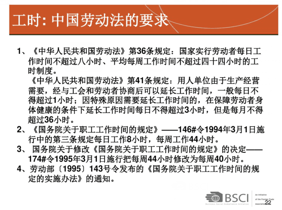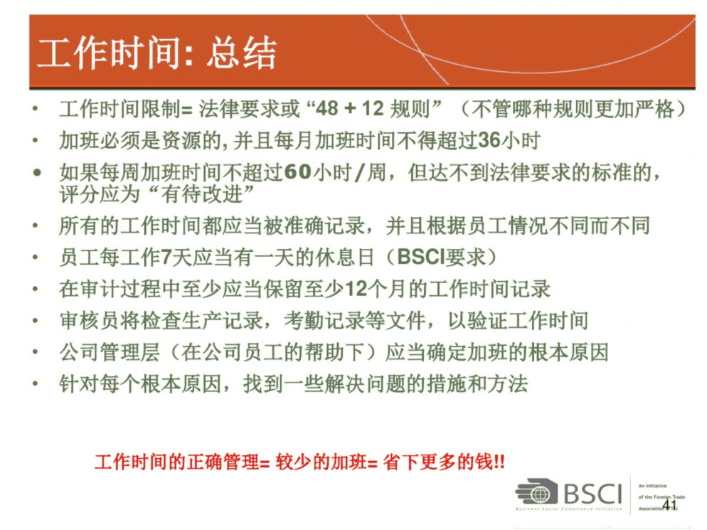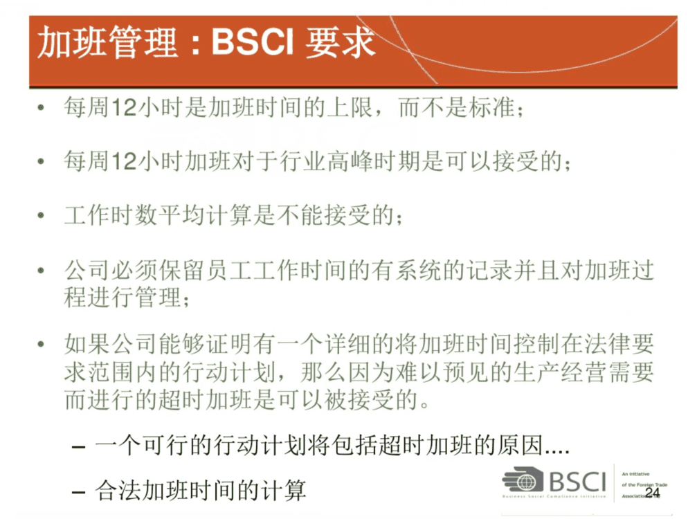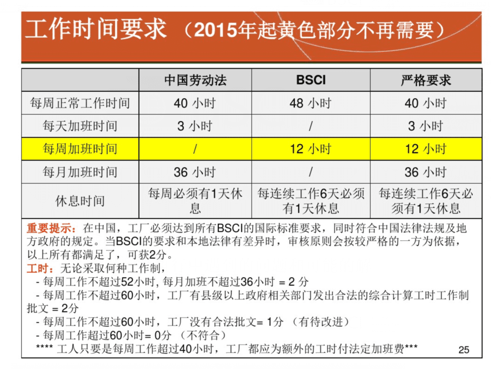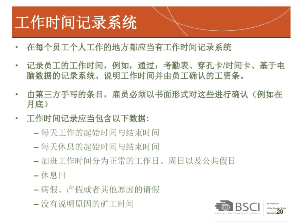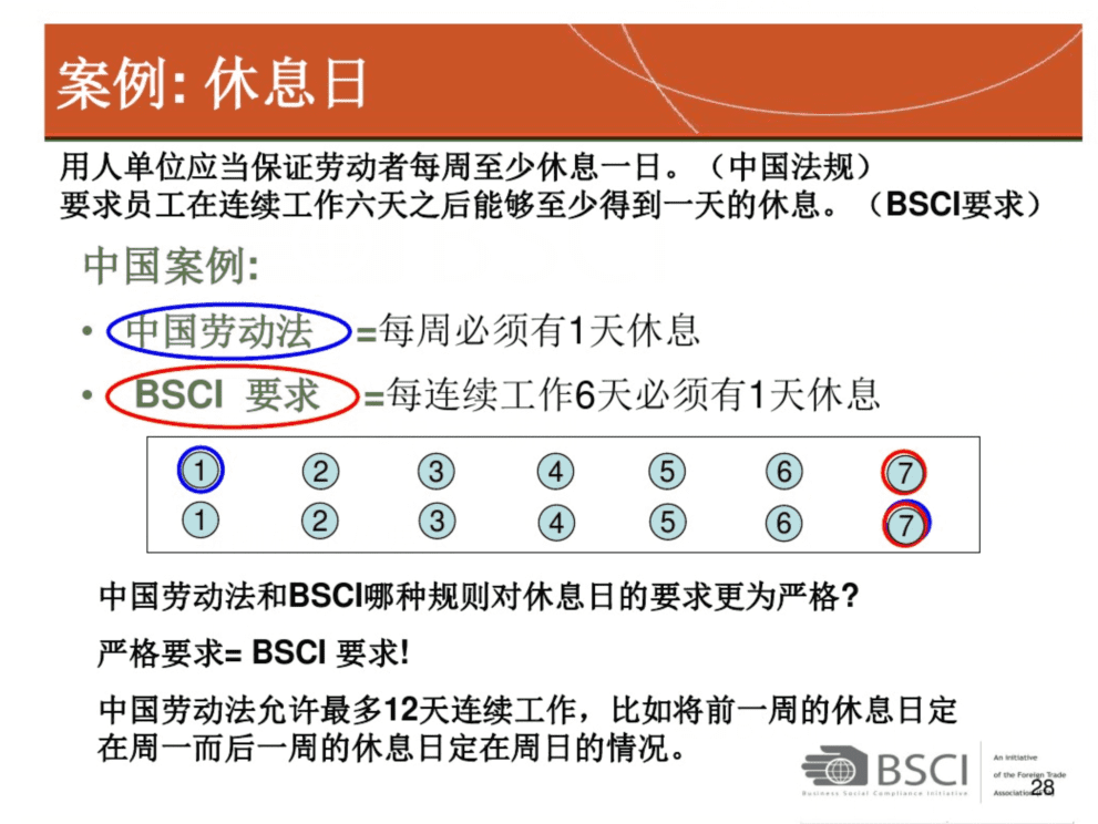 2016BSCI认证工时规定,周工时不超过60小时,每7天至少保证员工休息1天。如果工厂想拿BSCI认证A、B等级,月加班工时不得超过36小时。如果月加班工时超过36小时,分数再高,也只能拿C等级,所以想拿2年有效期报告的工厂要特别注意了。
