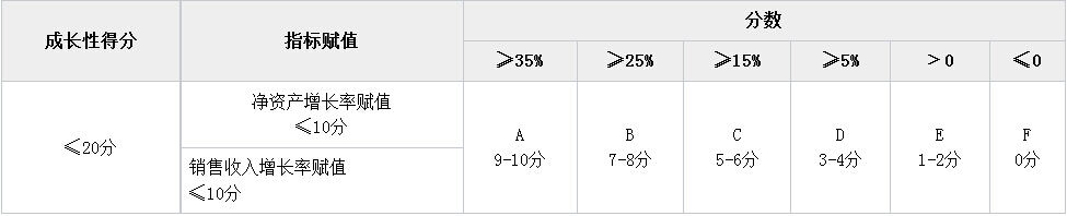 以上两个指标分别对照下表评价档次(ABCDEF)得出分值,两项得分相加计算出企业成长性指标综合得分。